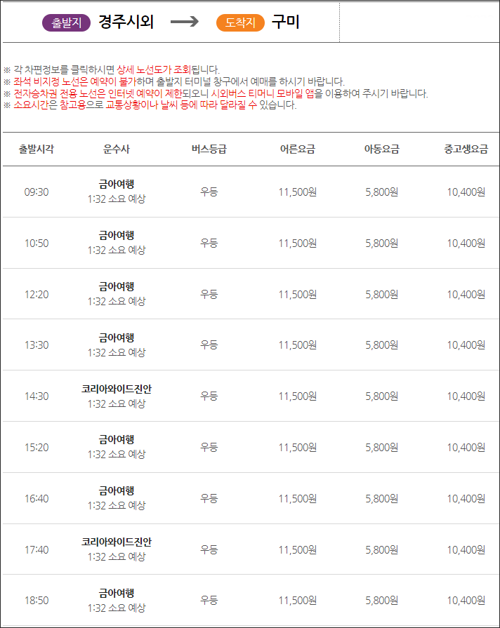 경주시외버스터미널 구미 버스 시간표, 요금, 예매