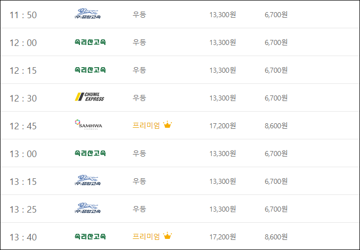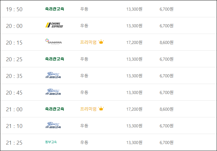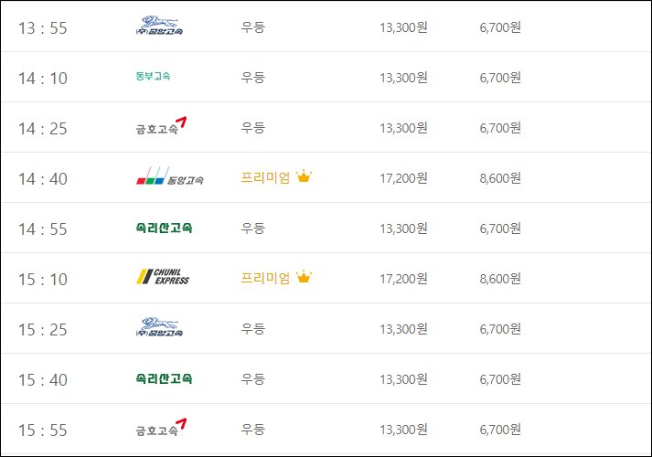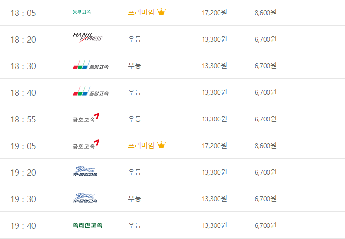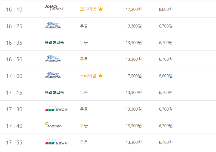 요금은 (우등) 성인 13,300, 아동 6,700, (심야) 성인 14,600, 아동 7,300, (프리) 성인 17,200, 아동 8,600, (심야) 성인 18,900, 아동 9,500으로, 세종청사가는 버스표 예매할 분들은 아래 링크를 클릭하세요.