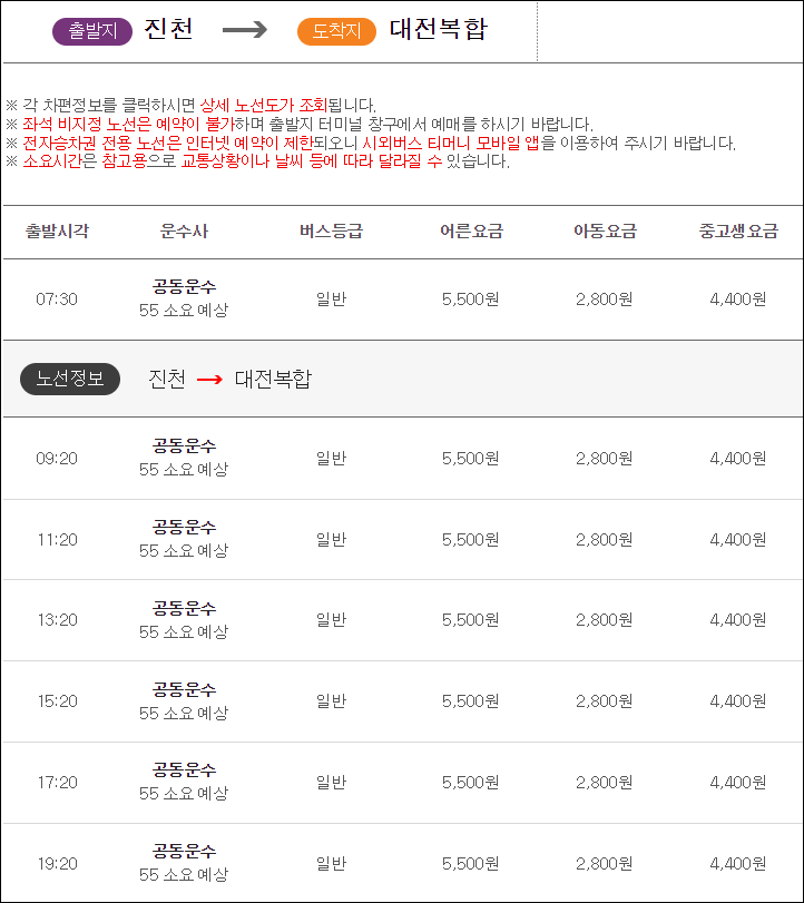 진천 종합버스 터미널에서 대전 광역시로 가는 고속버스/시외버스는 하루에 7번 운행하고 있습니다. 코로나로 인해 버스가 많이 줄었는데요, 코로나가 풀리면 더 많은 차량이 배차될 것으로 보이며, 첫차시간는 오전 7시 30분, 막차시간은 저녁 7시 20분에 출발합니다. 대전 복합터미널까지 소요되는 시간은 약 52분~58분 정도 소요되며 교통흐름과 버스노선에 따라 목적지 도착시간이 달라질 수 있습니다. 운행하는 버스 요금은 어른 5,500원, 청소년 4,400원, 어린이 2,800원으로, 티켓 예매할 분들은 아래 예매하기를 클릭하세요.